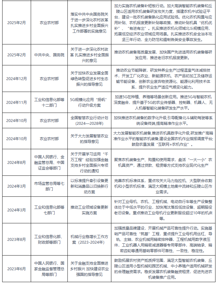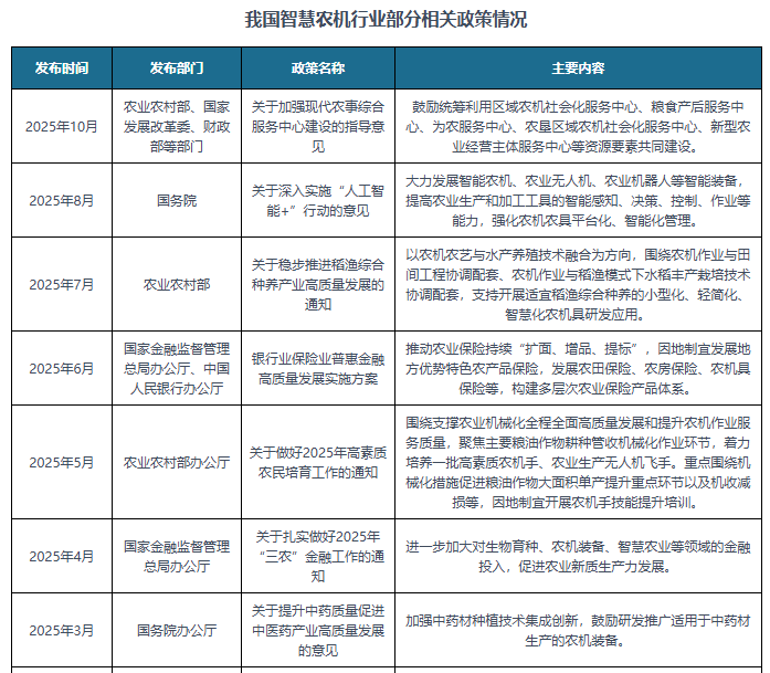 为了进一步鞭策聪慧农机行业的成长,我国连续发布了多项政策,如2025年8月国务院等发布《关于深切实施“人工智能+”步履的看法》鼎力成长智能农机、农业无人机、农业机械人等智能配备,提高农业出产和加工东西的智能、节制、功课等能力,强化农机耕具平台化、智能化办理。